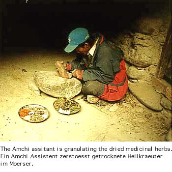 Dies führt zwangsläufig zum Vernachlässigen und letztendlich zum Vergessen alter Heilpraktiken und der Kenntnis um den Einsatz notwendiger Heilpflanzen und Mineraliensubstanzen in dieser Region. In Nordmustang leben heute von den ursprünglich über dreissig Amchi Ärzten nur noch fünf Vertreter, und die Sicherung ihres traditionellen Wissens durch Nachkommen ist nicht gewährleistet, - drei von ihnen sind Mönche, die Söhne des vierten Amchis haben sich für andere Berufe entschieden, der fünfte Amchi hat keine Nachkommen.